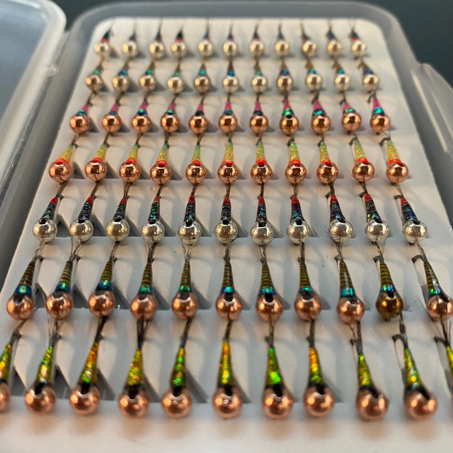 Each box comes with a solid 70 flies in 7 unique patterns. Great for anchor flies, or to use as a dropper under your favorite dry. A pocket sized (3×4 1/2″) Fly Fish Food logo fly box is included. Flies are all barbless jig hooks sized #16 or #14 . The larger flies come with a 3.5mm bead to get your flies down to the bottom quickly and into the strike zone. Whether you’re new to Euro nymphing looking for a starter set of flies, or a veteran needing a quick refill before hitting the water, this fly assortment was made with you in mind.