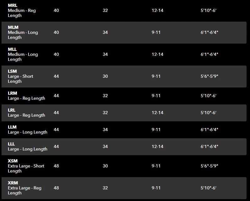 - 2nd letter indicates size in length of leg, R being regular and L being long